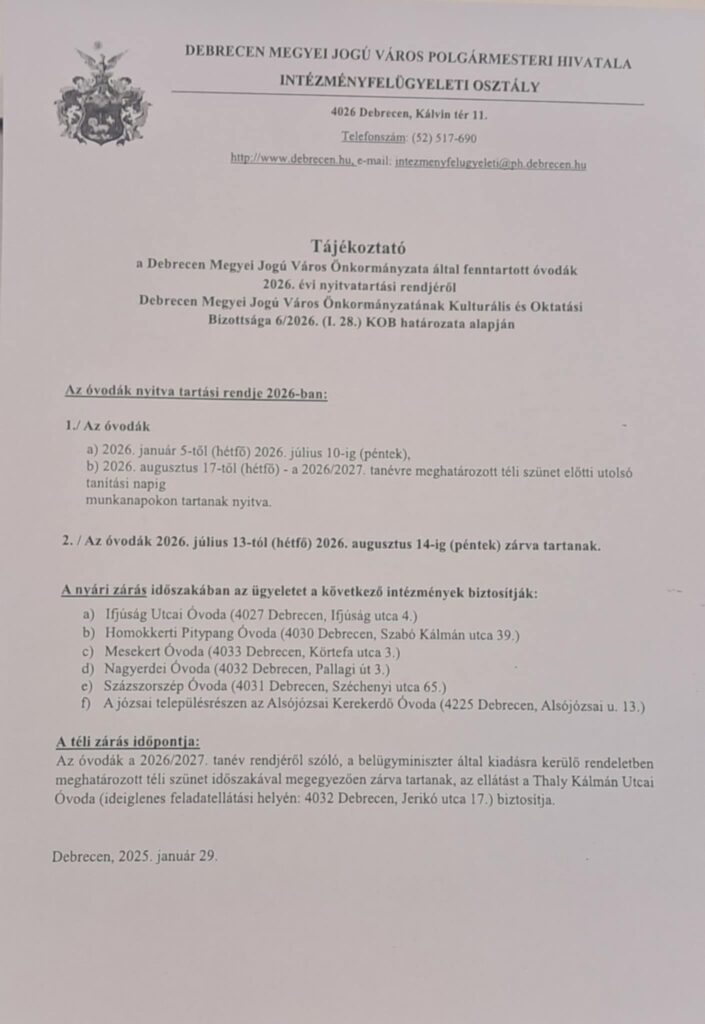 A nyári zárás (2025.07.14.-08.22.) ideje alatt ügyintézésre, szerdánként 8-14 óráig ügyeleti időben van lehetőség.
