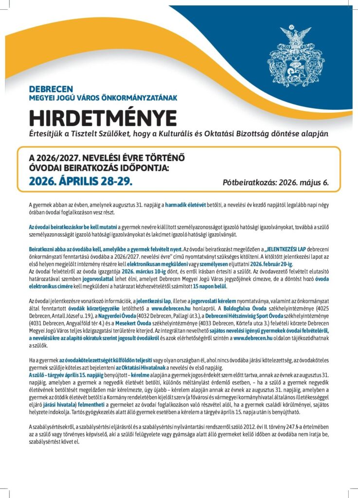 – 28-29-én 2025/2026. nevelési évre történő óvodai beiratkozás a leendő óvodásoknak. Tájékoztató a beiratkozással kapcsolatban lentebb a csatolt óvodai beiratkozási plakáton olvasható.